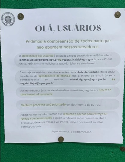 O cartaz observado traz um claro desrespeito aos operadores de comércio exterior. Ao informar que o atendimento será realizado exclusivamente por e-mail e que não haverá prioridade de processos, além de negar atendimento presencial aos representantes dos importadores e exportadores, os servidores estão criando obstáculos intransponíveis para o regular andamento das atividades comerciais. Tal postura é inadmissível, especialmente porque o Estado deve atuar de forma eficiente e garantir a continuidade do serviço público, como previsto no artigo 37 da Constituição Federal.