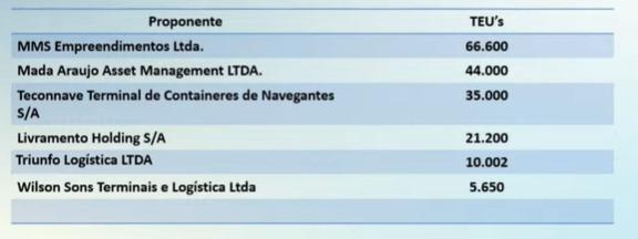 De acordo com a classificação das propostas apresentadas para o processo Seletivo Simplificado, o certame contou com a inscrição de sete (07) empresas, onde puderam apresentar a quantidade de TEUs (contêineres), oferecendo o maior número de movimentação, denominado por Movimentação Mínima Exigida (MME), sendo elas pela ordem: MMS Empreendimentos Ltda (MME: 66.600 Teus), Mada Araújo Asset Management Ltda (MME: 44.000 Teus), Teconnave Terminal de Containeres de Navegantes S/A (MME: 35.000 Teus), Livramento Holding S/A (MME: 21.200 Teus), Conexão Marítima Ltda (MME: 20.111 Teus), Triunfo Logística Ltda (MME: 10.002 Teus) e Wilson Sons Terminais e Logística Ltda (MME: 5.650 Teus).