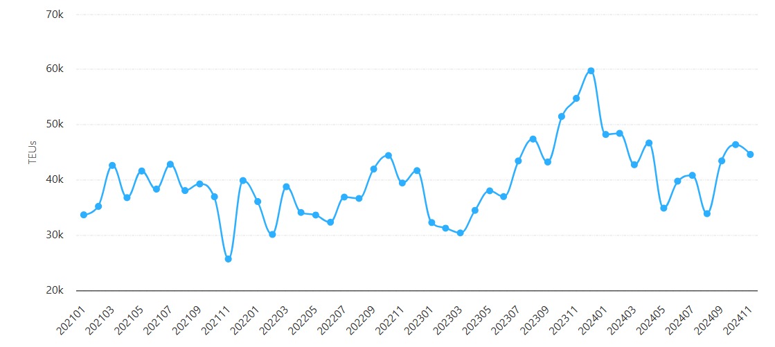 O gráfico abaixo revela o padrão de exportações de contêineres do Brasil para a China entre janeiro de 2021 e novembro de 2024. Os dados vêm do DataLiner da Datamar.