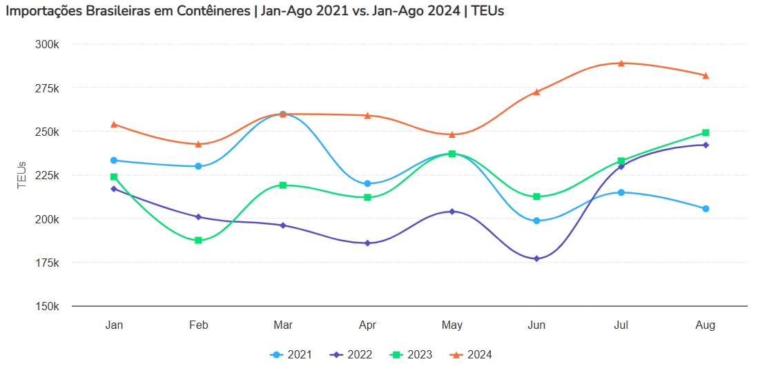 O gráfico a seguir utiliza dados extraídos do DataLiner, produto mestre da Datamar, para comparar as importações de contêineres registradas nos portos brasileiros de janeiro a agosto, desde 2021.