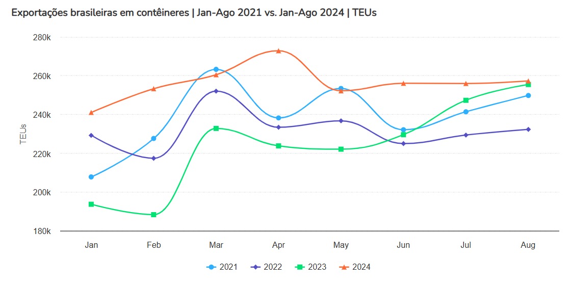 O gráfico a seguir usa dados extraídos do DataLiner para comparar as exportações de contêineres nos portos brasileiros de janeiro a agosto nos últimos três anos.