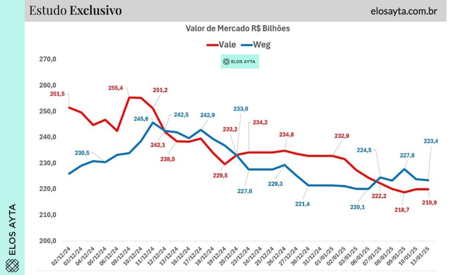 Conforme demonstra o gráfico, a Vale já havia ultrapassado a Weg durante seis pregões em dezembro, no intervalo entre os dias 12 e 19. “A continuidade dessa tendência em janeiro de 2025 aponta para uma consolidação dessa nova ordem no mercado”, diz o estudo.