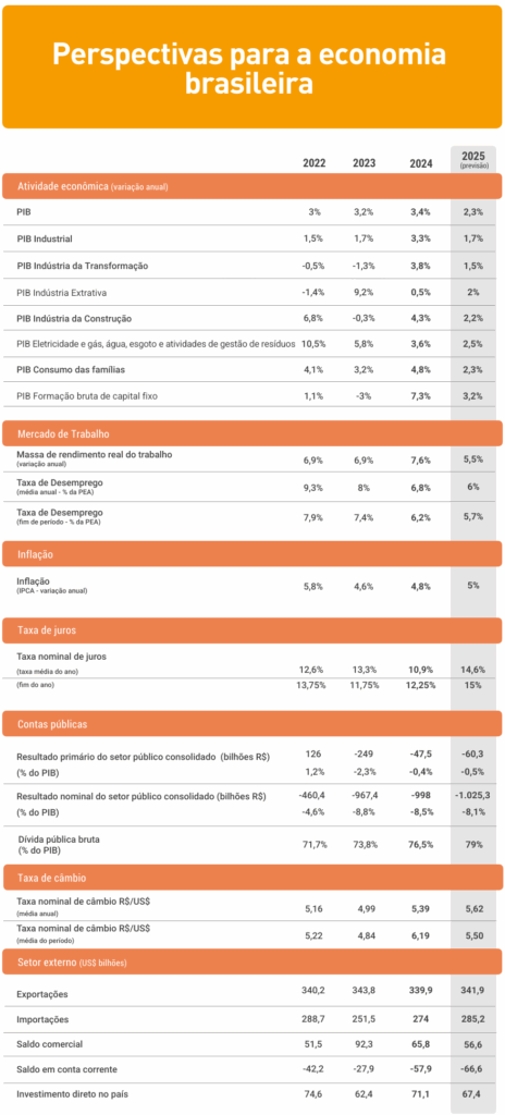 A inflação atual, as expectativas para o IPCA e as incertezas do cenário externo devem contribuir para que o Comitê de Política Monetária (Copom) do Banco Central mantenha a taxa básica de juros, a Selic, em 15% ao ano até o fim de 2025. A política monetária contracionista deve limitar a 5,8% o crescimento real das concessões de crédito, abaixo dos 10,6% de 2024.