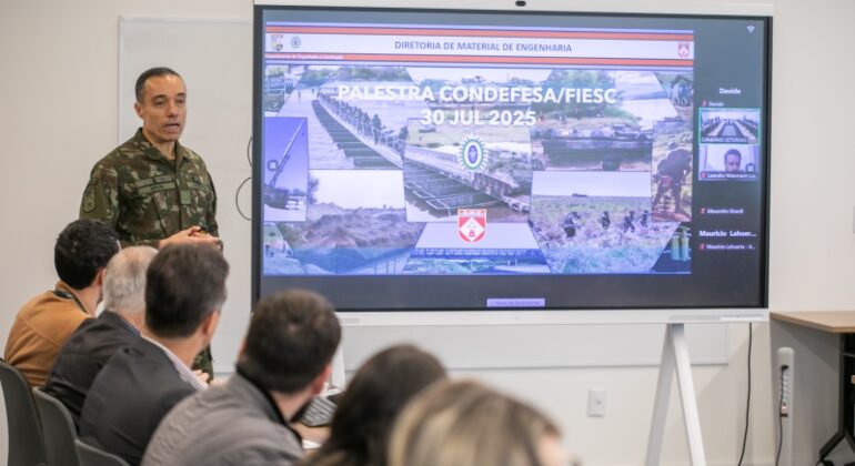 Fortalecimento da base industrial de defesa, redução de custos, autonomia e agilidade no fornecimento estão entre os benefícios de ampliar o volume de compras nacionais pelas Forças Armadas. Com o objetivo de ampliar a aproximação do Exército com a indústria catarinense para encontrar e desenvolver produtos brasileiros para as necessidades do Departamento de Engenharia da Força, o General de Brigada Luís Cláudio Brion Cardoso, diretor de Material de Engenharia do Exército Brasileiro, detalhou nesta quarta-feira (30) as demandas de materiais para os membros do Conselho de Desenvolvimento da Indústria de Defesa – CONDEFESA da FIESC.