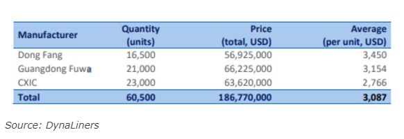 De acordo com o relatório da DynaLiners, a Evergreen fez três pedidos separados para os seguintes fabricantes de contêineres: