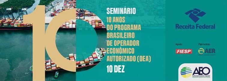 Receita Federal realiza, na próxima terça-feira, dia 10 de dezembro, em São Paulo, seminário em comemoração aos 10 anos do Programa Brasileiro de Operador Econômico Autorizado (OEA). O evento acontece das 8h30 às 18h e terá transmissão ao vivo pelo canal da Federação das Indústrias do Estado de São Paulo (Fiesp) no YouTube. Clique aqui para acompanhar.