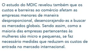 O estudo do MDIC revelou também que os custos e barreiras ao comércio afetam as empresas menores de maneira desproporcional, desencorajando-as a buscar os mercados globais. Sendo assim, como a maioria das empresas pertencentes às mulheres são micro e pequenas, se faz necessário medidas que reduzam os custos de entrada no mercado internacional.