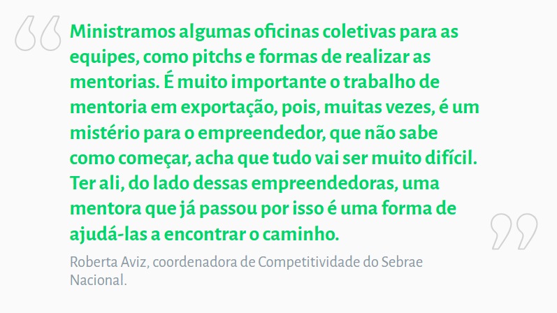 A ação pretende auxiliar no desenvolvimento de competências e habilidades técnicas e socioemocionais necessárias à atividade exportadora com palestras e workshops. Entre as áreas de atuação, a maioria das empresas mentoradas são de alimentos, bebidas e produtos do agronegócio, seguidas por empresas de moda, higiene pessoal e cosméticos, móveis, e outros produtos e serviços.