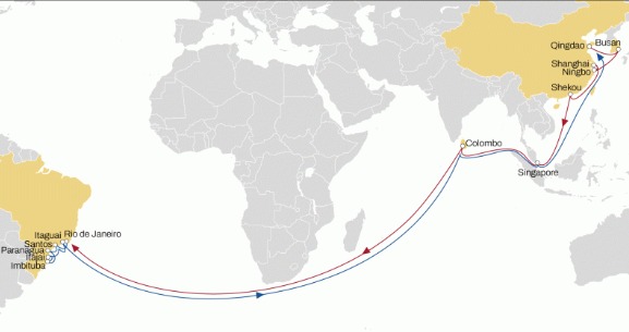 Qingdao – Busan – Ningbo – Shanghai – Shekou – Singapore – Colombo – Rio de Janeiro – Santos – Paranaguá – Imbituba – Itajaí – Santos – Itaguaí – Colombo – Singapore – Qingdao