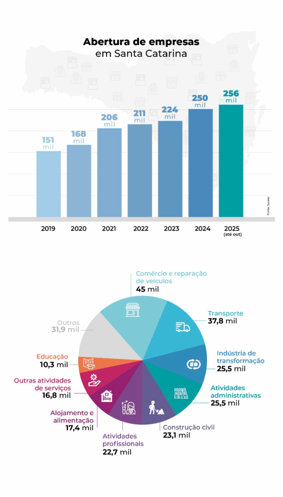 Dados da Jucesc mostram que o setor de comércio e reparação de veículos lidera a abertura de empresas em 2025, com 45 mil novos CNPJs. Em seguida aparecem transporte (37,8 mil), indústria de transformação (25,5 mil), atividades administrativas (25,5 mil), construção civil (23,1 mil) e atividades profissionais, científicas e técnicas (22,7 mil).