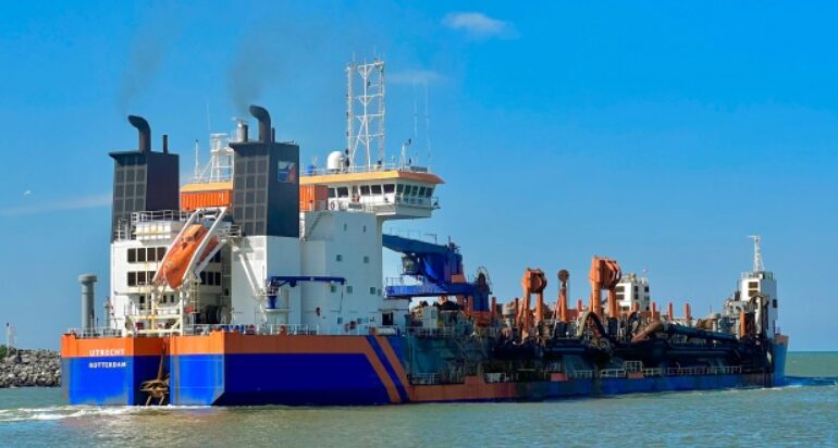 A embarcação holandesa Utrecht chega para atuar com os serviços de dragagem de sedimentos através de sucção.