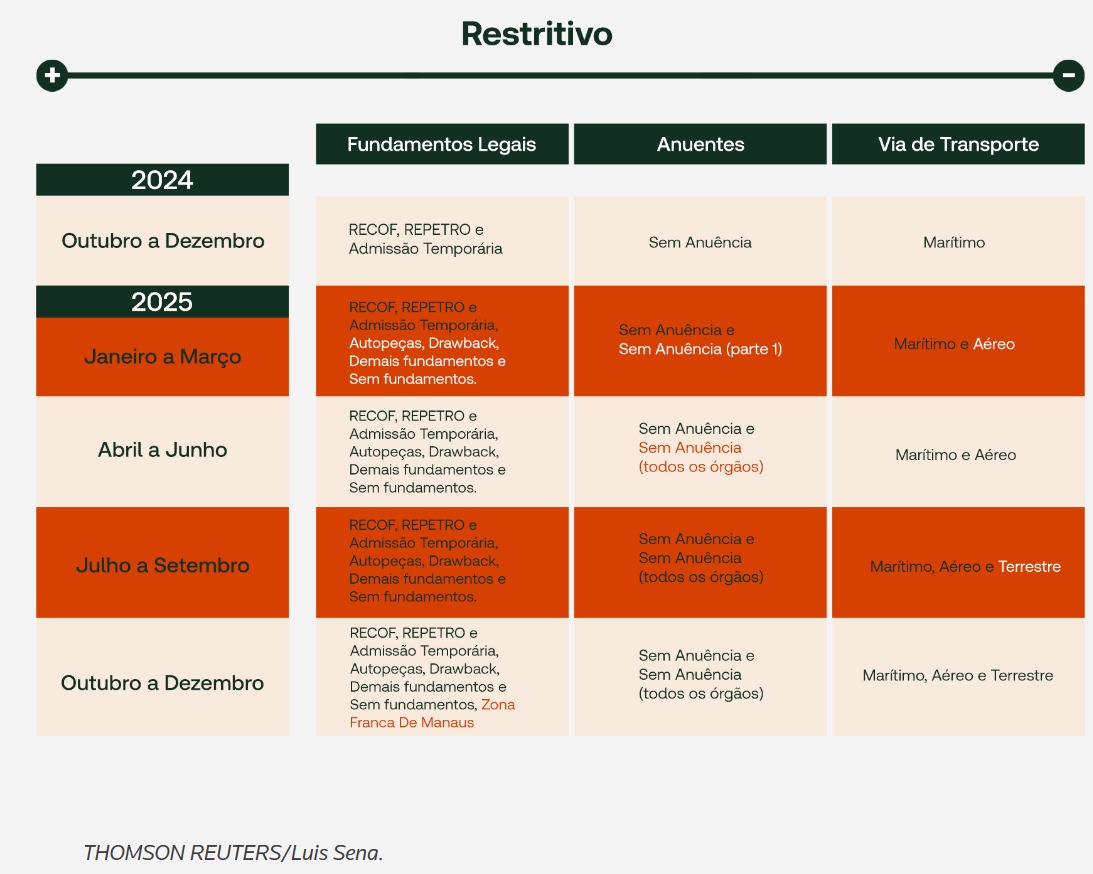 A partir de janeiro de 2025, a obrigatoriedade abrangerá os “demais fundamentos legais” (exceto Zona Franca de Manaus), importações “sem fundamento” (pagamento integral de impostos) e o modal aéreo. Essa fase também inclui a primeira etapa da obrigatoriedade da anuência via LPCO, com os órgãos anuentes a serem definidos pelo governo.