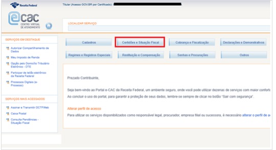 Passo 2. Após logar com a conta gov.br, selecionar a opção “Certidões e Situação Fiscal”.