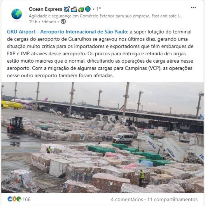 Em publicações feitas nos últimos dias na rede Linkedin, empresas e profissionais do segmento de comércio exterior e transporte internacional estão fazendo um alerta sobre a situação do transporte aéreo de cargas através do mais movimentado terminal aéreo do país, o Aeroporto Internacional de São Paulo, em Guarulhos (SP).