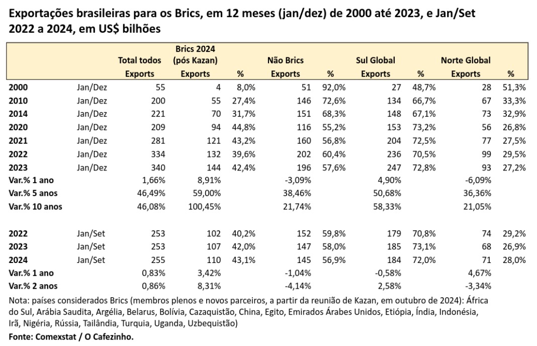 Em 2024, os mesmos países compraram 144 bilhões de dólares em produtos brasileiros, ou 42% de tudo que exportamos nos 9 primeiros meses do ano. Em 10 anos, as exportações brasileiras para os Brics cresceram 100%, ao passo que as vendas para os não-Brics subiram somente 22%. Quando olharmos para outra divisão geopolítica, separando o mundo entre Sul e Norte Global, a mudança é ainda mais impressionante.