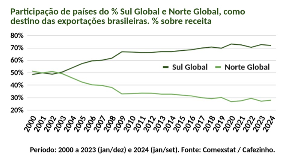 Em 2000, o Sul Global, que também se pode chamar de Maioria Global, porque compreende a maior parte do planeta, era o destino de 49% das exportações brasileiras. O Norte Global, que engloba EUA, Europa, Japão e todos os países chamado “desenvolvidos”, respondia em 2000 por 51% das exportações brasileiras. Hoje isso mudou completamente. O Sul Global hoje é destino de 73% das exportações brasileiras, e o Norte, por somente 27%.