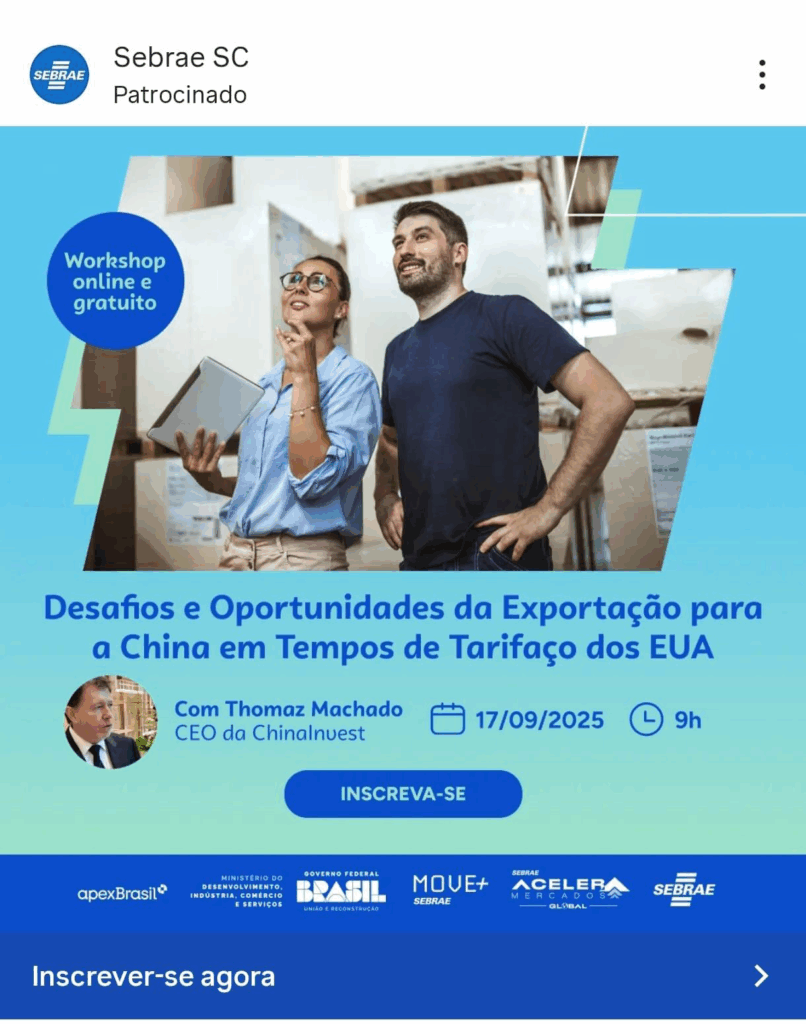 Para responder a essa questão, o Sebrae promove no próximo dia 17 de setembro de 2025, às 9h, um workshop online e gratuito com Thomaz Machado, CEO da ChinaInvest. Radicado em Shenzhen desde 2018, Thomaz é especialista em conectar empresas brasileiras ao mercado chinês e global, acumulando experiência prática em um dos maiores polos comerciais do mundo.