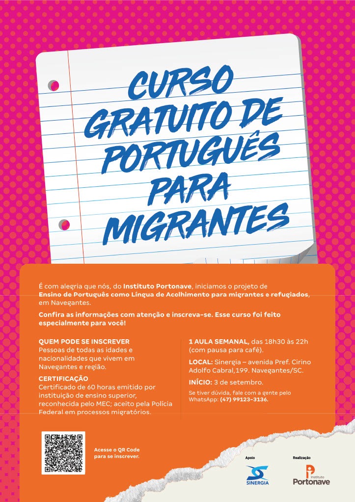 A iniciativa é destinada a migrantes de todas as idades e nacionalidades que possuem interesse em aperfeiçoar o idioma. A inscrição pode ser feita pelo link disponibilizado pelo Instituto Portonave: CLIQUE AQUI. Serão 12 semanas de curso, com quatro horas semanais presenciais e 12 horas de atividades complementares.