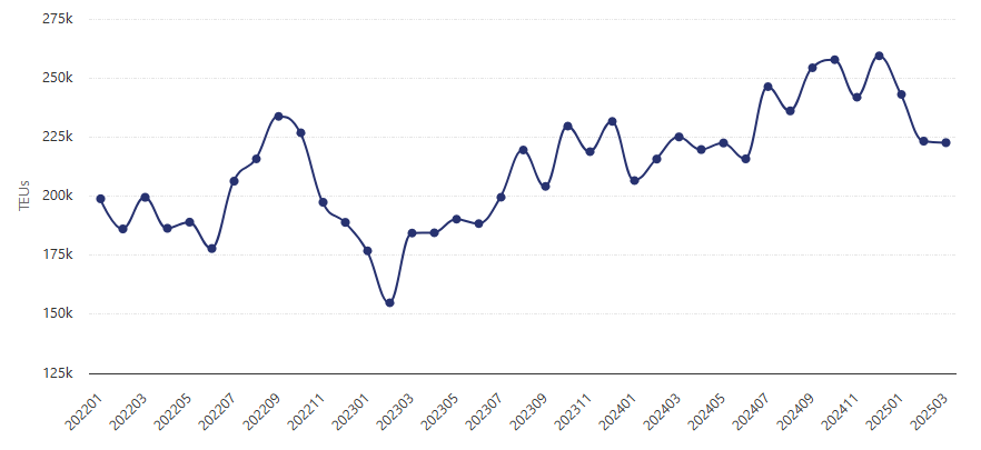 Movimentação de Contêineres no Porto de Santos |Jan 2022 – Mar 2025 | TEUs