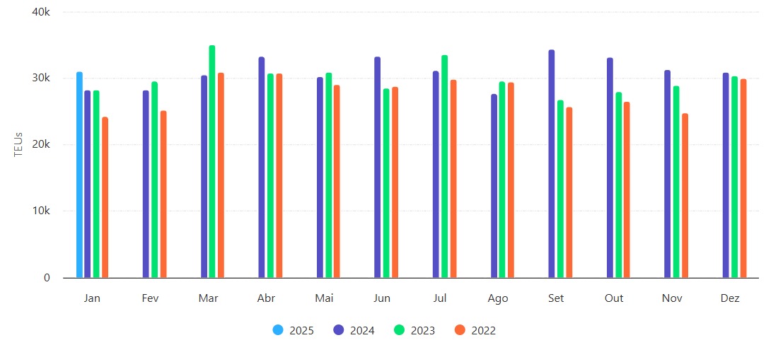 Exportações de Carne de Aves | Brasil | Jan 2022 – Jan 2025 | TEUs
