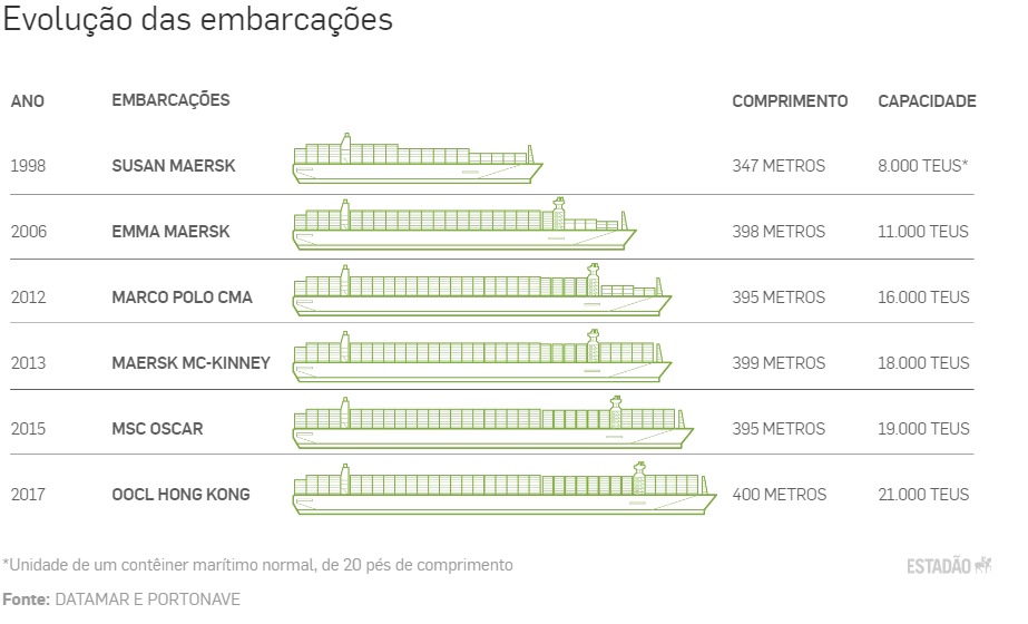 Para se ter a dimensão do porte desses navios, na quinta-feira, 1º, desembarcou no Porto de Santos o maior cargueiro que já chegou ao País, o MSC Natasha XIII, construído em 2018, com 366 metros de comprimento, e capacidade de 14,4 mil TEUs. Na última semana, também foi notícia o início da viagem do Icon of the Seas, o maior navio de cruzeiro do mundo, que tem 365 metros, que saiu de Miami, Flórida, no sábado, 27. Já a Vale, nos últimos anos, passou a operar supernavios de minério, que são graneleiros com capacidade de suportar mais peso que uma embarcação de contêineres, mas que não ultrapassam os 362 metros de comprimento.