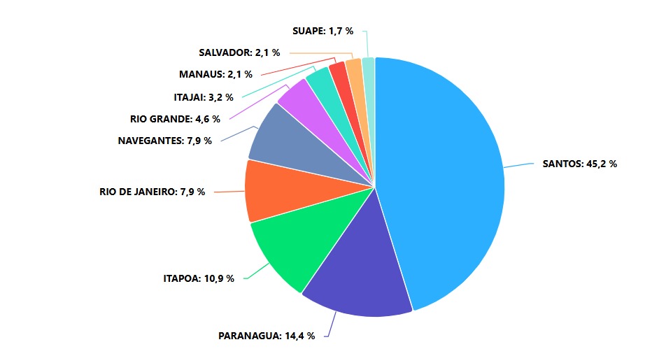O mais importante e estratégico é o Porto de Santos, o maior do Hemisfério Sul. Segundo a Autoridade Portuária de Santos (APS), ele está conectado a 600 destinos em mais de 190 países e responde por 30% do fluxo comercial nacional.