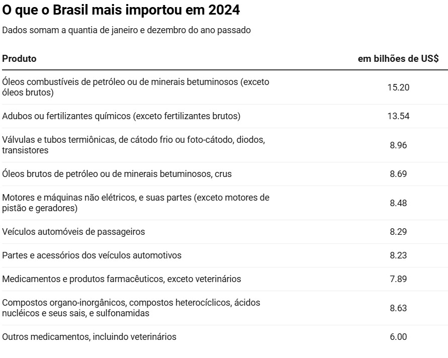 Pelos dados da Secex, o grupo de itens que lidera as importações é o de óleos combustíveis de petróleo e materiais betuminosos. Foram importados US$ 15,2 bilhões em 2024, sendo US$ 6,24 bilhões vindos da Rússia, o maior fornecedor. Em segundo lugar aparece o item adubos e fertilizantes, com volume total de US$ 13,54 bilhões. Novamente a Rússia lidera, com envios que somaram US$ 3,4 bilhões, segundo os dados do Secex.