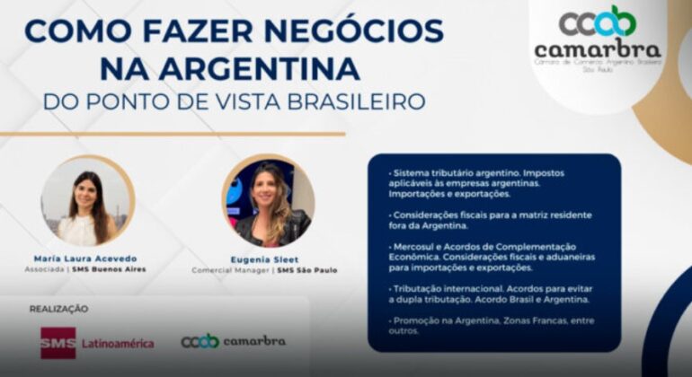 Os palestrantes serão María Laura Acevedo, associada da SMS Buenos Aires, e Eugenia Sleet, gerente comercial da SMS São Paulo; especialistas em direito tributário e comércio exterior. A transmissão será online via Zoom das 9h00 às 10h30 (horário do Brasil), e as inscrições estão disponíveis no Sympla.