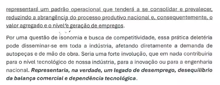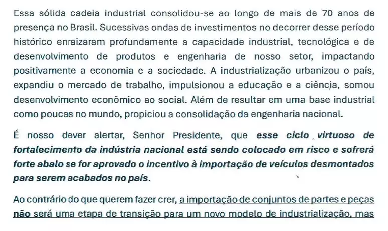 Na carta enviada a Lula, assinada pelos presidentes/CEOs da General Motors (Santiago Chamorro), Stellantis (Emanuelle Cappellano), Volkswagen (Ciro Possobom) e Toyota (Evandro Maggio), as montadoras – com sede nos EUA, Holanda, Alemanha e Japão – argumentam que “a importação de conjuntos de partes e peças não será uma etapa de transição para um novo modelo de industrialização, mas representará um padrão operacional que tenderá a se consolidar e prevalescer”.