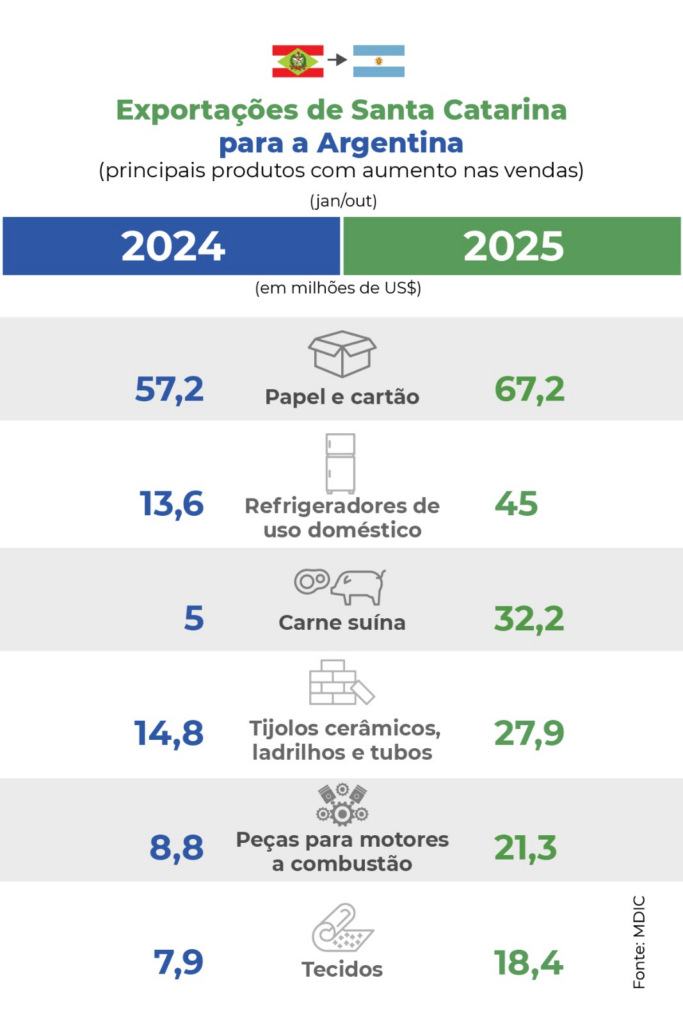 O faturamento das exportações de Santa Catarina com destino à Argentina saltou 25% entre janeiro e outubro de 2025, conforme dados do Ministério do Desenvolvimento, Indústria, Comércio e Serviços (MDIC). O aquecimento das vendas para os argentinos é resultado principalmente da elevação do envio de produtos industrializados de diferentes setores econômicos.
