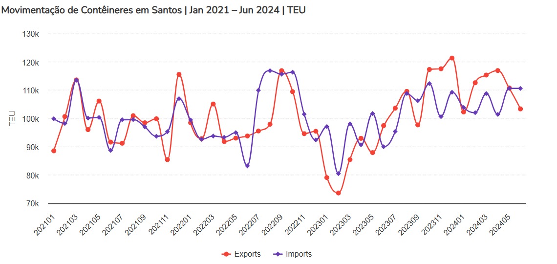 O gráfico abaixo usa dados do DataLiner para comparar importações e exportações de contêineres de longo curso no Porto de Santos entre janeiro de 2021 e junho de 2024.