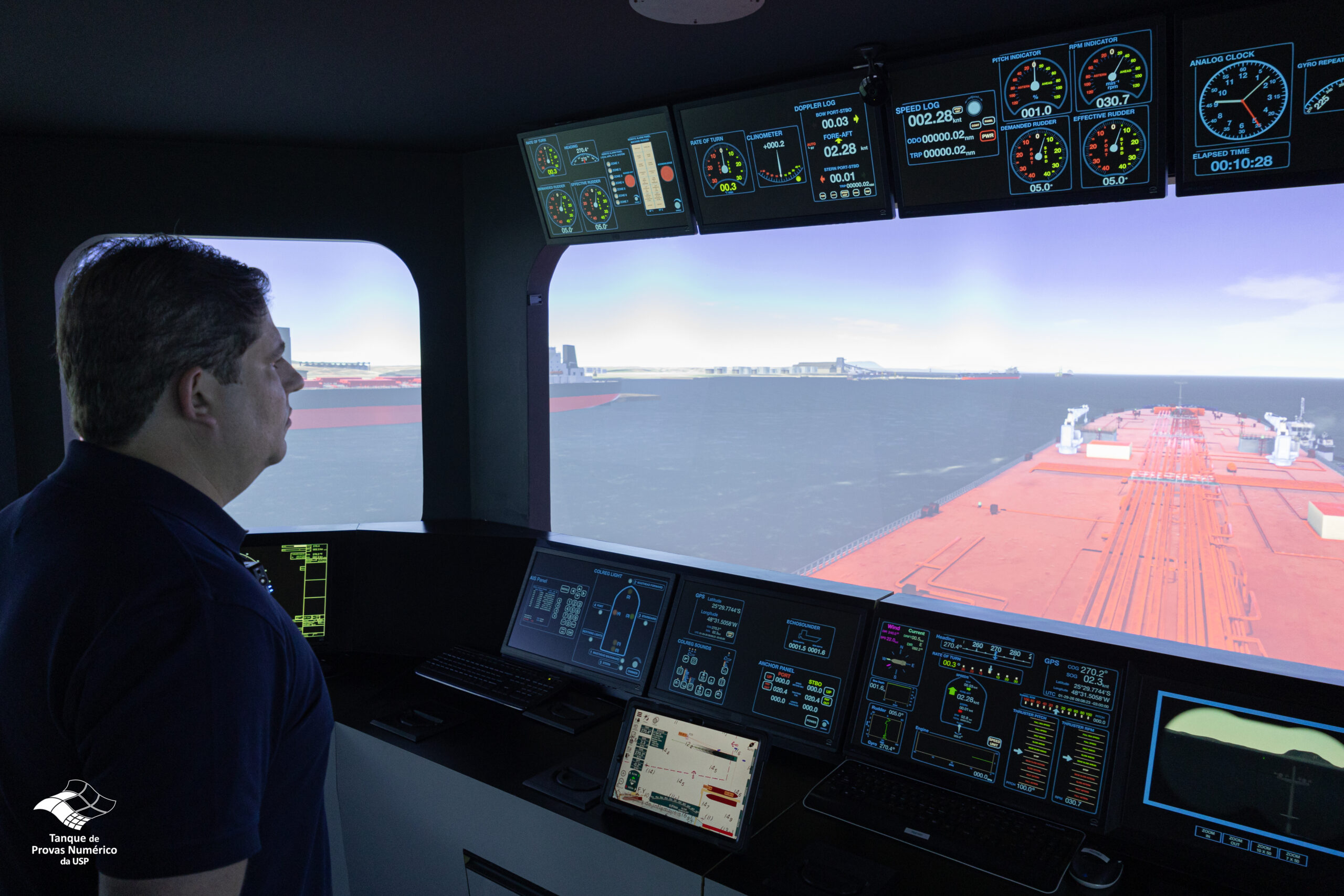 As simulações foram conduzidas no Tanque de Provas Numérico da Universidade de São Paulo (TPN-USP) e reuniram práticos, comandantes de rebocadores, representantes da Capitania dos Portos e técnicos da Portos do Paraná.