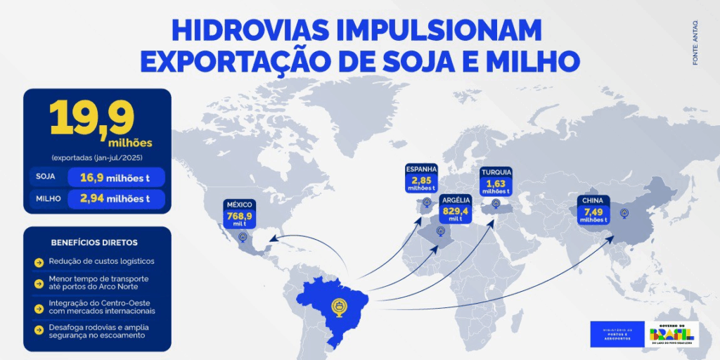 Mais do que corredores de exportação, as hidrovias representam a integração entre o interior produtivo e os mercados globais. Ao transformar rios em vias permanentes de comércio exterior, o Brasil fortalece sua infraestrutura logística e consolida sua liderança mundial não apenas na produção e exportação de soja e milho, mas também de outras commodities agrícolas estratégicas.