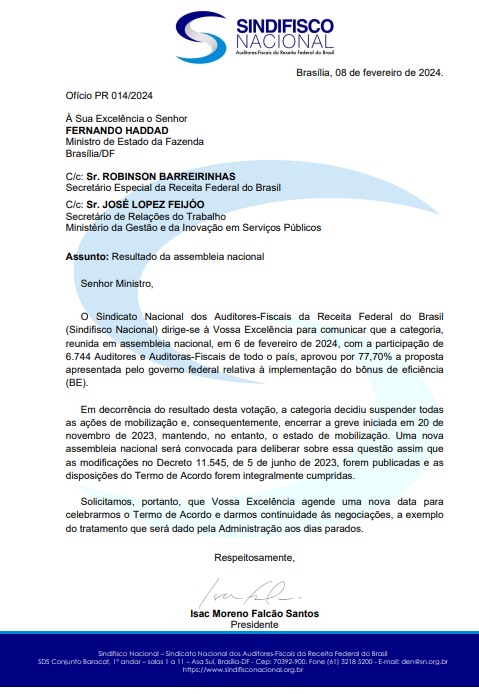 “Os auditores-fiscais estão ansiosos para retomarem as suas atividades e normalizarem os serviços efetuados pela Receita Federal após 81 dias de greve“, diz Isac Falcão, presidente do Sindifisco Nacional.