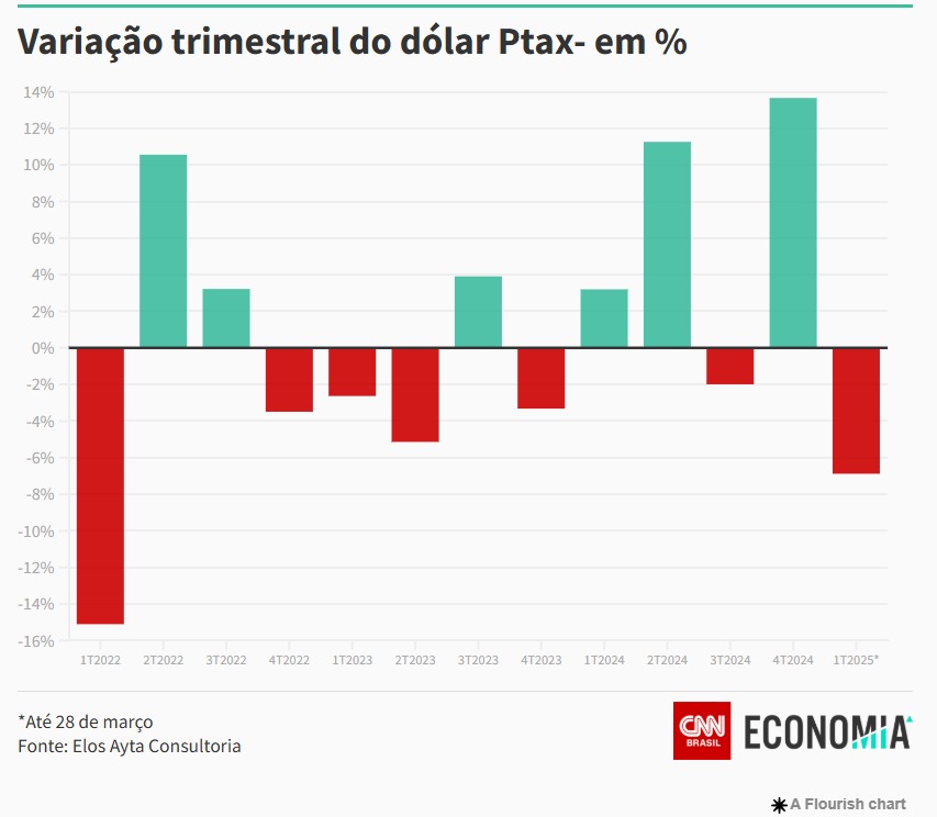 Na direção oposta, o dólar Ptax — calculado pelo Banco Central (BC) — desvalorizou quase 6,9% entre janeiro e março, a R$ 5,766 na venda.