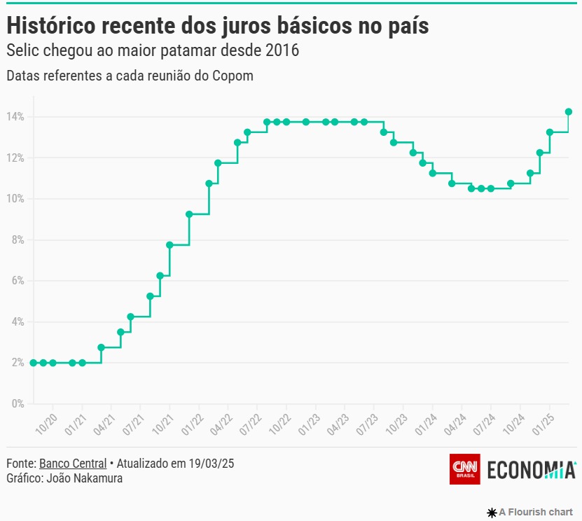 Espera-se que o Copom eleve a taxa Selic em mais 1 ponto percentual, a 14,25% ao ano, como já foi sinalizado pela própria autarquia no encontro de janeiro.