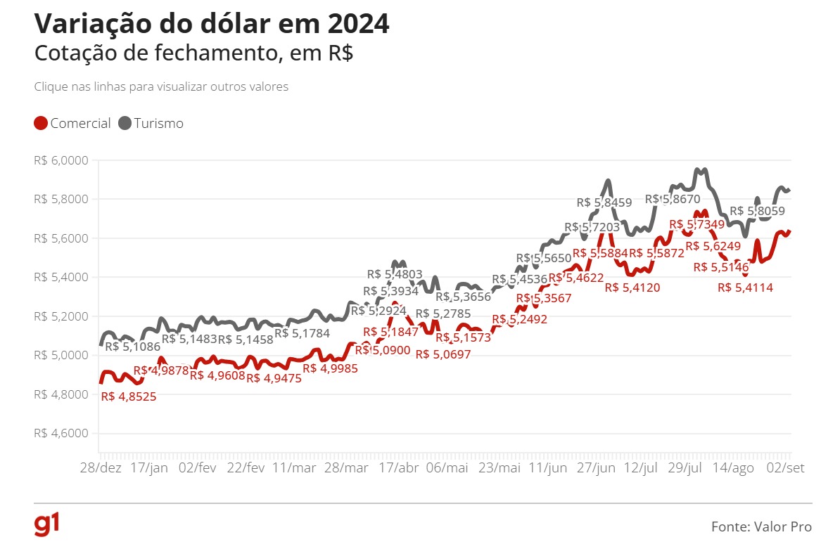O dólar fechou em alta nesta terça-feira (3), apesar de o Produto Interno Bruto (PIB) do Brasil registrar, no segundo trimestre de 2024, um resultado muito acima das projeções.