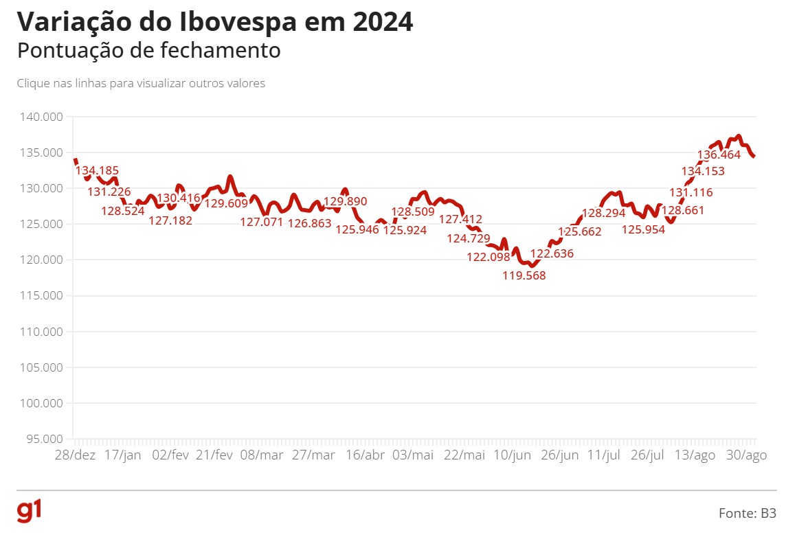 O Ibovespa, principal índice acionário da bolsa de valores brasileira, a B3, fechou o dia em alta. Dólar acumula alta de quase 28% em 2024.