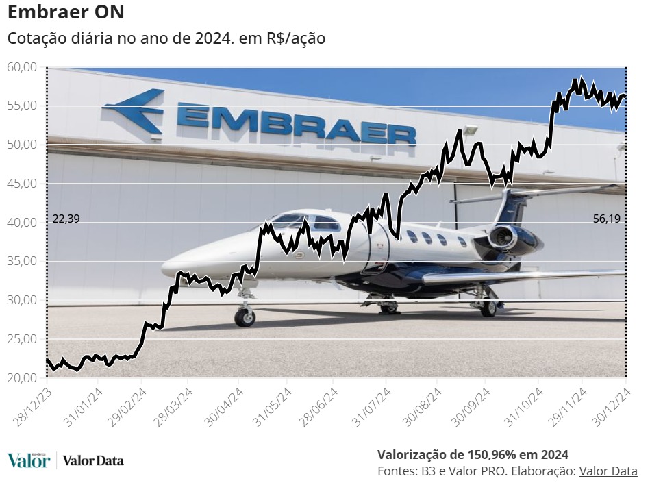 No último ano, os papéis da fabricante de aviões decolaram nada menos que 150% – a maior alta do Ibovespa no período. Em 2025, a empresa já acumula ganhos de dois dígitos, na casa dos 12%.