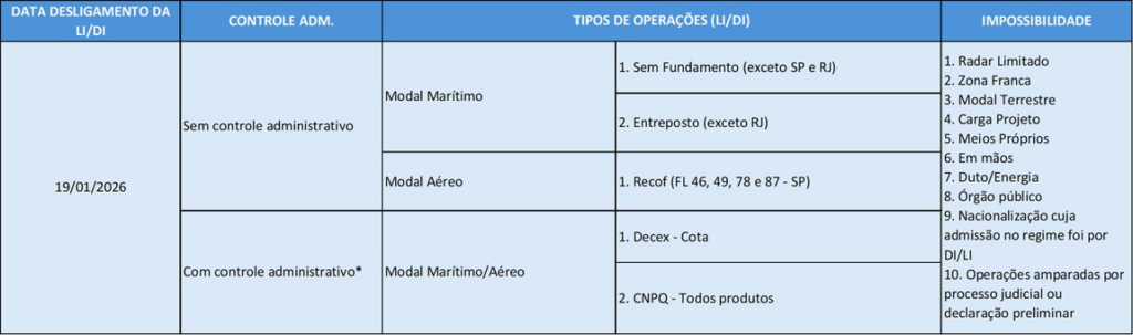 3. LI registradas com controle administrativo antes da data de desligamento: poderão ser vinculadas às Declarações de Importação (DI) mesmo após a data de desligamento.