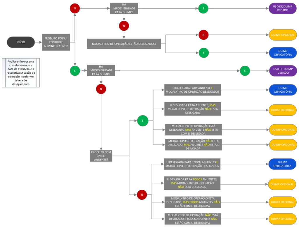 Como forma de facilitar o entendimento do Cronograma, foi elaborado fluxograma para verificação diária das regras de DUIMP obrigatória, DI obrigatória ou DUIMP opcional.