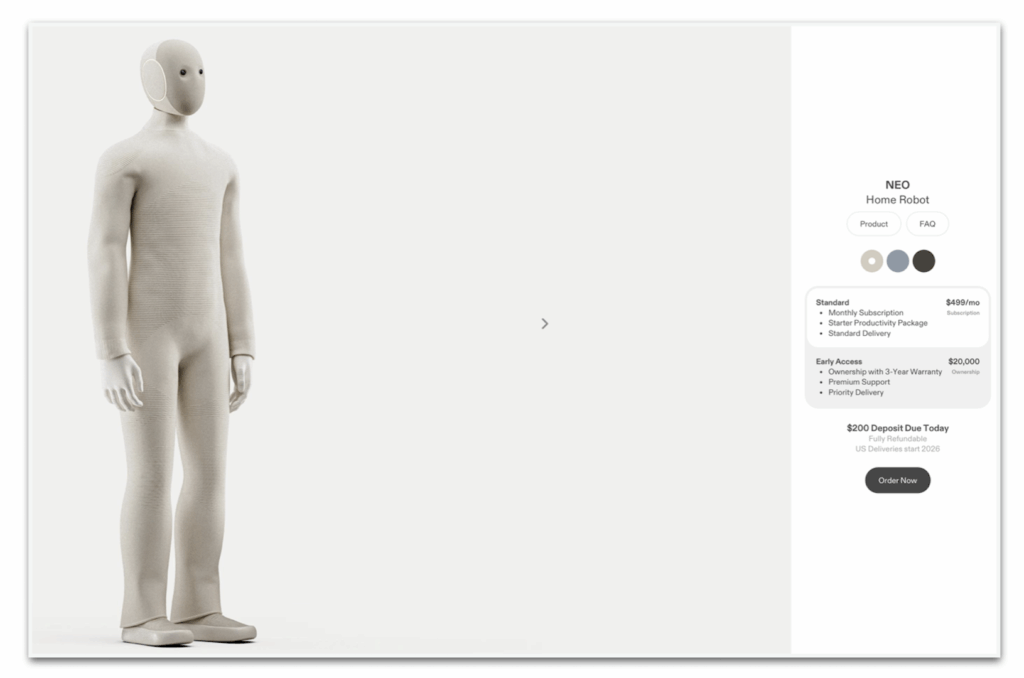O Neo será comercializado por US$ 20.000 (aproximadamente R$ 107.200, considerando o dólar a R$ 5,36) com previsão de entrega para 2026. A 1X Tech também oferece opção de aluguel por US$ 499 mensais (cerca de R$ 2.675), com contrato mínimo de seis meses. As aquisições podem ser feitas por meio de um programa de pré-venda aberto ao público.