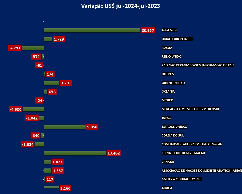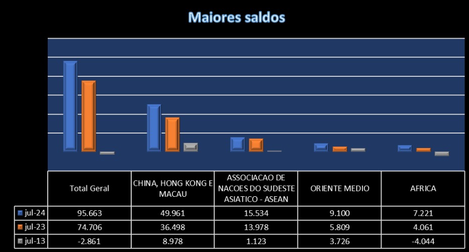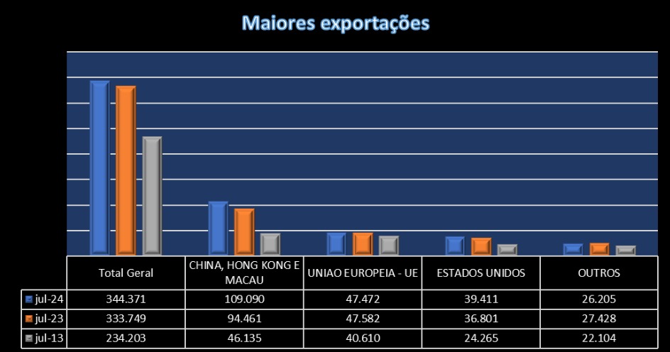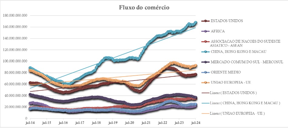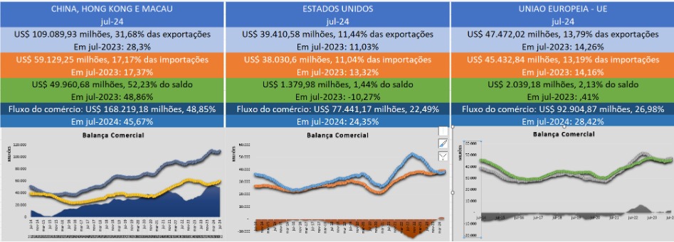 China continua garantindo o crescimento da balança comercial brasileira. Nos 12 meses encerrados em julho, o Bloco China-Hong Kong e Macau continuaram aumentando seu fluxo de comércio, em relação aos outros dois grandes parceiros comerciais, Estados Unidos e União Europeia.