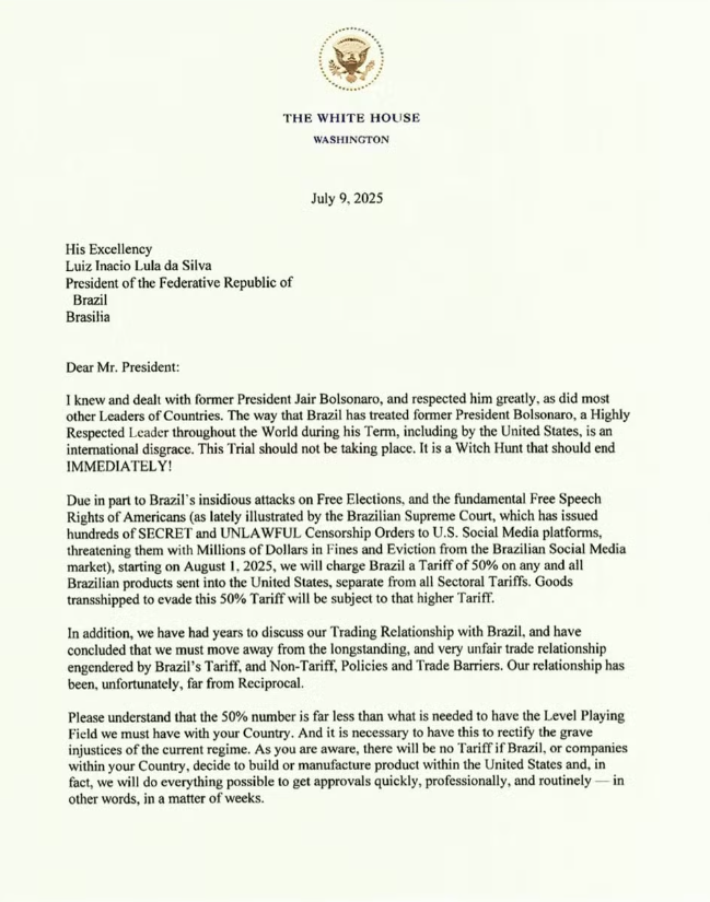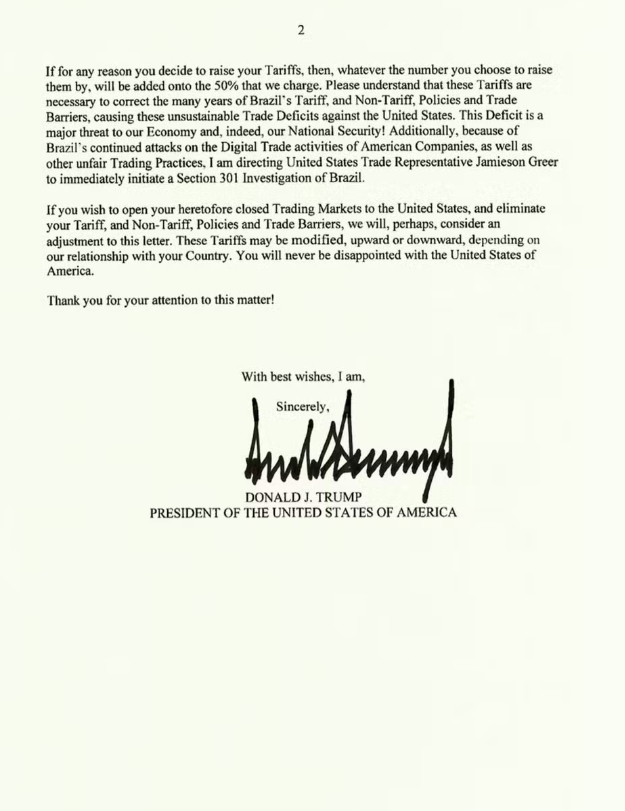 Se por algum motivo o senhor decidir aumentar suas tarifas, então qualquer que seja o número que escolher aumentá-las, será acrescentado aos 50% que cobraremos. Por favor, entenda que essas tarifas são necessárias para corrigir os muitos anos de políticas tarifárias e não-tarifárias do Brasil, causando déficits comerciais insustentáveis contra os Estados Unidos. Esse déficit é uma grande ameaça à nossa economia e, de fato, à nossa segurança nacional! Além disso, por causa dos contínuos ataques do Brasil às atividades comerciais digitais das empresas americanas, bem como de outras práticas comerciais desleais, estou instruindo o Representante de Comércio dos Estados Unidos, Jamieson Greer, a iniciar imediatamente uma investigação de Seção 301 contra o Brasil.