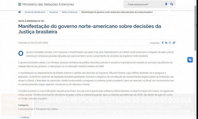 O Ministério das Relações Exteriores (MRE) divulgou nesta quarta-feira (26) nota criticando manifestação do governo Trump contra decisões do Supremo Tribunal Federal (STF) que incluem bloqueios de redes sociais americana