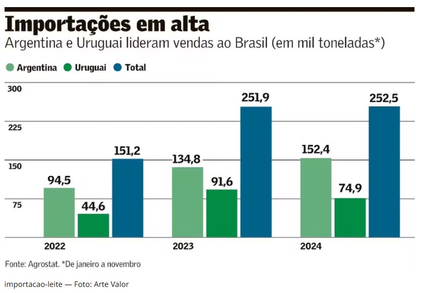 De janeiro a novembro de 2024, o Brasil importou 252,5 mil toneladas de lácteos, especialmente de Argentina e Uruguai, de acordo com as estatísticas do Ministério da Agricultura. O volume é pouco superior ao do mesmo período de 2023, quando as importações somaram 251,9 mil toneladas, mas 60% maior do que as 151,2 mil toneladas do intervalo entre janeiro e novembro de 2022.