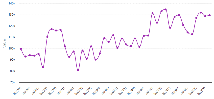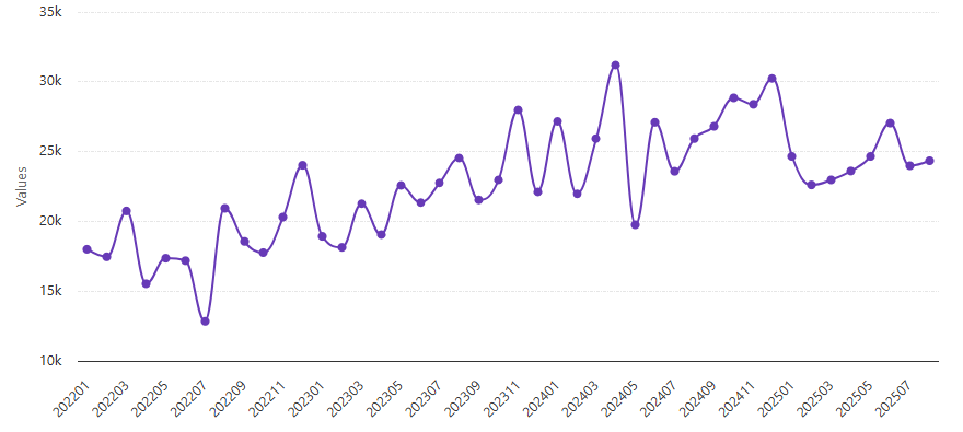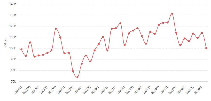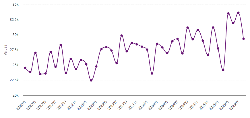 Confira a seguir um histórico da movimentação de contêineres no longo curso no Porto do Rio Grande no período de janeiro de 2022 a agosto de 2025. O gráfico foi elaborado com dados do DataLiner e exclui movimentações internas, transbordo e cabotagem: