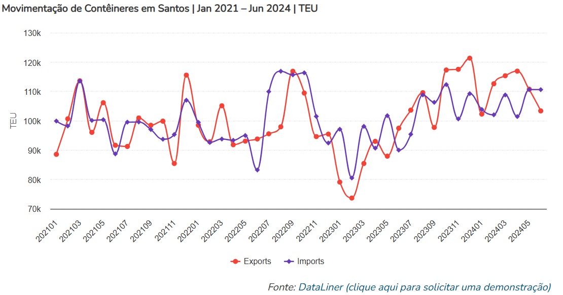 O gráfico abaixo usa dados do DataLiner para comparar importações e exportações de contêineres de longo curso no Porto de Santos entre janeiro de 2021 e junho de 2024.