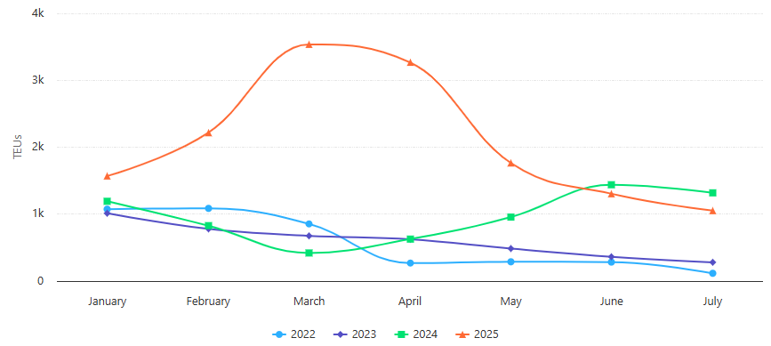 Exportações Brasileiras de Carne aos EUA | Jan 2022 a Julho de 2025 | TEUs