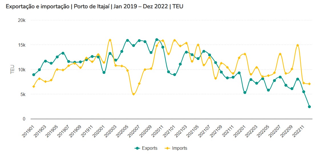 O gráfico abaixo compara as exportações e importações de contêineres no Porto de Itajaí entre janeiro de 2019 e dezembro de 2022, período em que as operações de contêineres começaram a diminuir no porto. Os dados são do DataLiner.